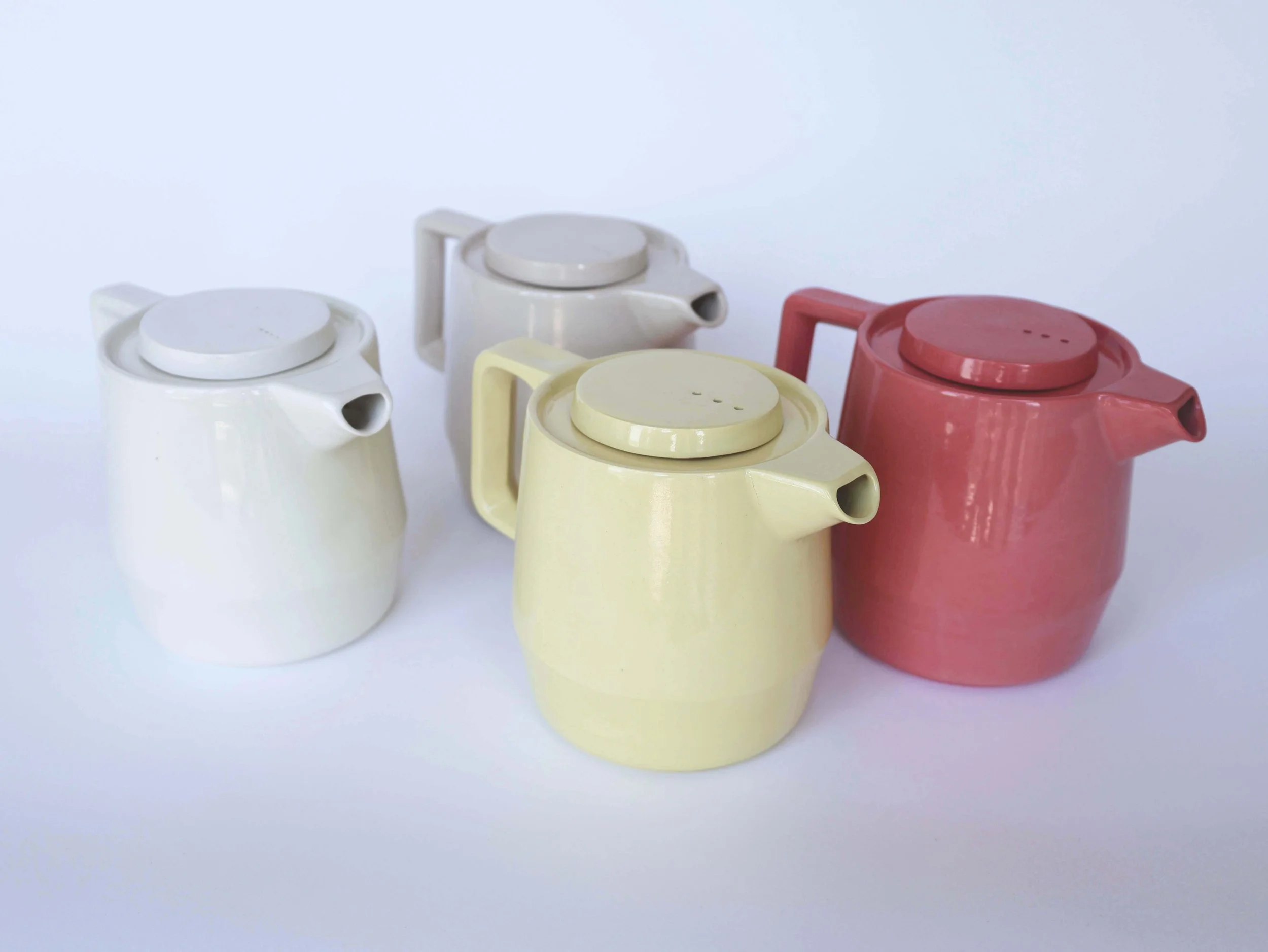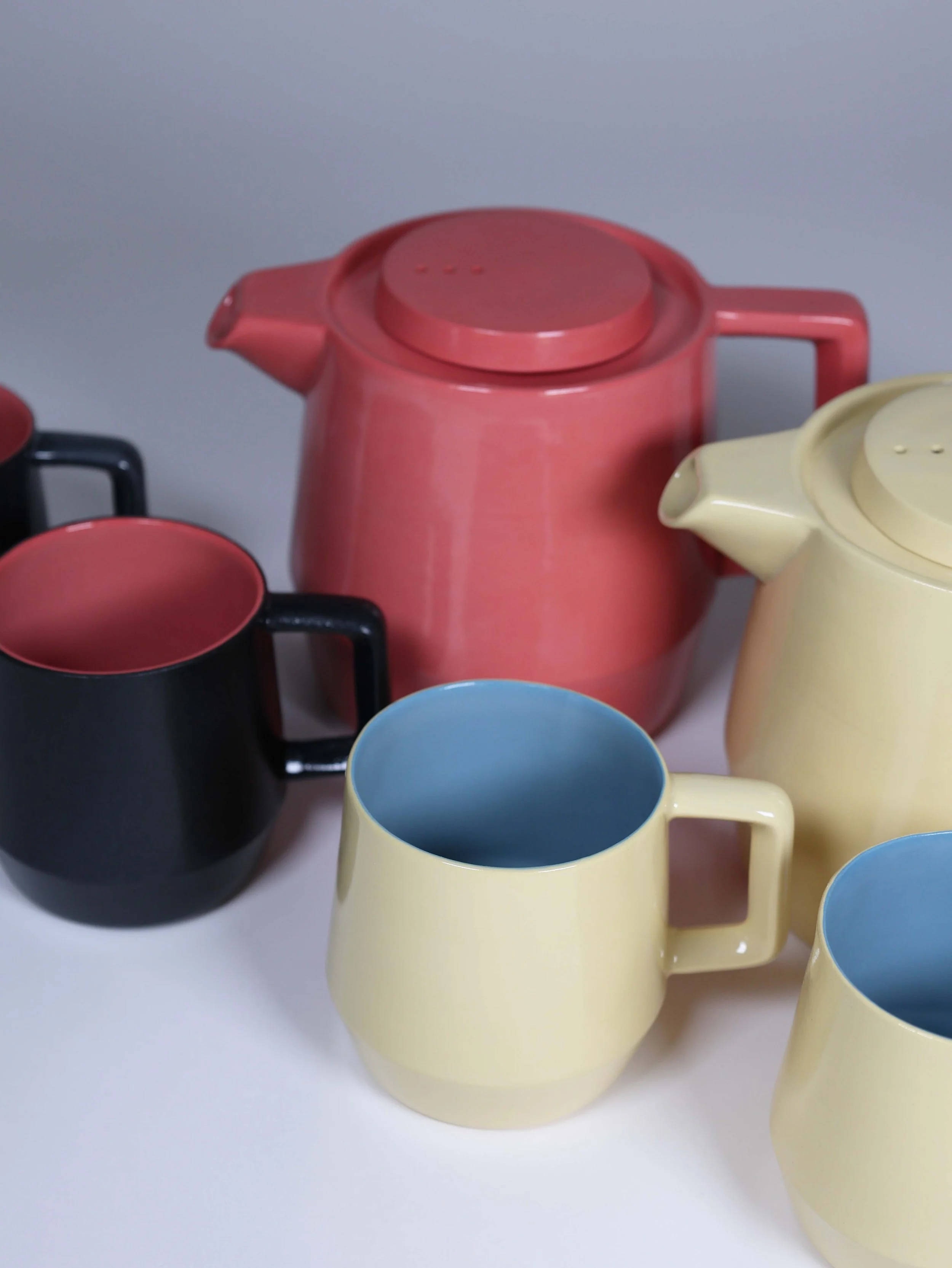 The T-4-4 Collection comprises a 1.3 litre teapot, together with four 325ml mugs, a milk jug and sugar bowl. The Collection is slip cast using plaster moulds in either stoneware or porcelain. The mugs, jugs and sugar bowl are cast in different layers of coloured slip and glazed to complement each teapot.