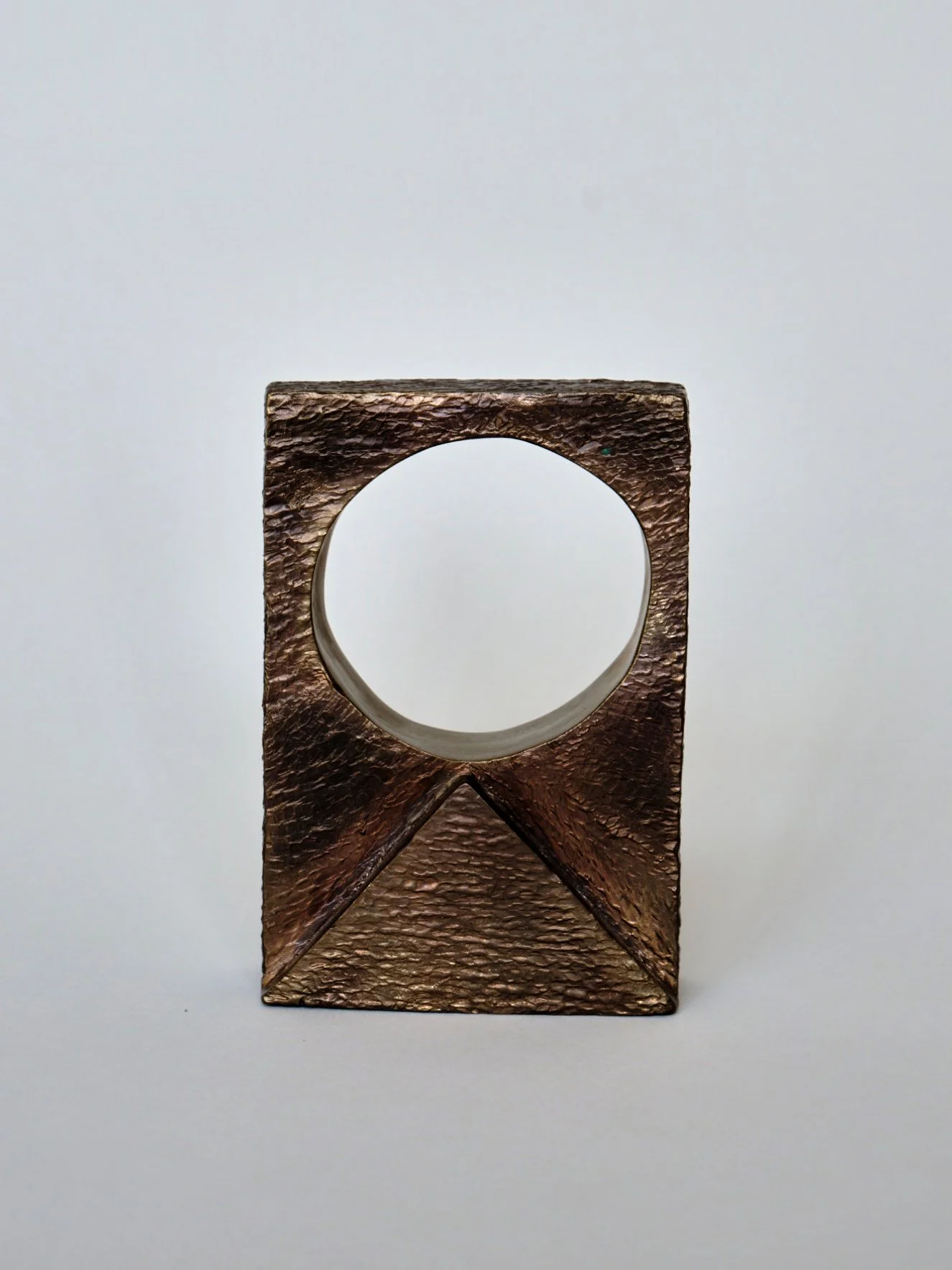 ‘Corona’ is cast in bronze and inspired by my study of the work of mid-century modern sculptors and designers, in particular Barbara Hepworth. Bronze casting is the next step for a ceramicist and many of the skills are transferable. This small bronze sculpture was created using the lost wax method, whereby a wax model is made in a silicone mould from a clay model, then the wax is burned out of the ceramic mould, ready for the molten bronze to be cast. It is an exhilarating process dating back thousands of years!